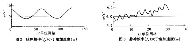 流量計產(chǎn)生誤差的主要因素是脈動流的頻率,所加的正弦脈動流的頻率與穩(wěn)態(tài)下渦輪的旋轉(zhuǎn)角加速度的關(guān)系為ω=2πfp(1/qm)r2時,相應(yīng)曲線與輸入正弦曲線最為接近,與理論分析基本吻合,多次改變脈動流頻率、振幅參數(shù),發(fā)現(xiàn)有時圖形失真非常厲害,通過對多幅圖形的比較,發(fā)現(xiàn)有如下規(guī)律:(見圖2、3)