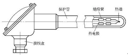 一般由熱電極、絕緣套管、保護(hù)管、接線盒組成。普通型熱電偶按其安裝時(shí)的固定形式可分為固定螺紋連接、固定法蘭連接、活動(dòng)法蘭連接無(wú)固定裝置等多種形式。