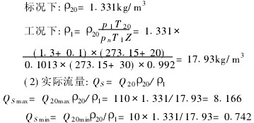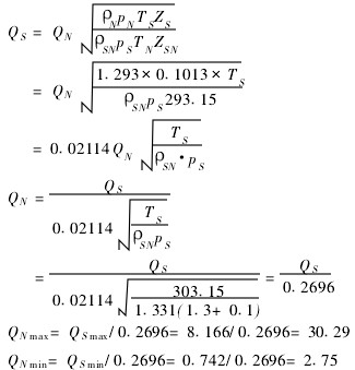式中:ZS(ZSN)為被測氣體在標(biāo)準(zhǔn)狀態(tài)(工作狀態(tài))下壓縮系數(shù)(一般情況ZSUZSN);QS為工況下氧氣的實(shí)際流量;QN為標(biāo)況下空氣的實(shí)際流量;QN為標(biāo)況下空氣的密度(11293kg/m3);pN為標(biāo)準(zhǔn)大氣壓;TN為標(biāo)準(zhǔn)溫度293115K;QSN為標(biāo)況下氧氣的密度(即Q20);pS為氧氣實(shí)際工作壓力(即p1);TS為氧氣實(shí)際工作溫度(即T1)。