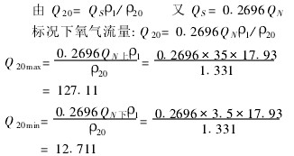 其流量上限FH應(yīng)為金屬轉(zhuǎn)子流量計(jì)刻度上限所對應(yīng)的標(biāo)準(zhǔn)狀態(tài)下的氧氣流量,因?yàn)榻饘俎D(zhuǎn)子流量計(jì)的刻度為標(biāo)準(zhǔn)狀態(tài)下空氣標(biāo)注,所以必須將其轉(zhuǎn)換為標(biāo)準(zhǔn)狀態(tài)下氧氣流量。