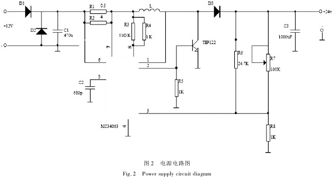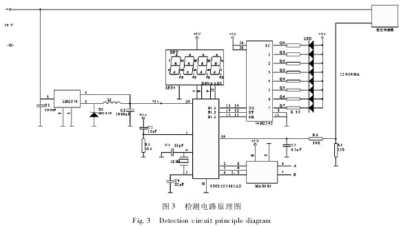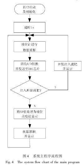 0引言 液位包括液位信號(hào)器和連續(xù)液位測(cè)量?jī)煞N。液位信號(hào)器是對(duì)幾個(gè)固定位置的液位進(jìn)行測(cè)量,用于液位的上、下限報(bào)警等;連續(xù)液位測(cè)量是對(duì)液位連續(xù)地進(jìn)行測(cè)量,廣泛應(yīng)用于農(nóng)田灌溉、定量施量、高爐沖渣水位測(cè)量、環(huán)境監(jiān)測(cè)等農(nóng)業(yè)生產(chǎn)領(lǐng)域,具有非常重要的意義。目前,對(duì)液位測(cè)量的精度要求不僅愈來(lái)愈高,且需要測(cè)量?jī)x能夠適應(yīng)一些特殊環(huán)境,如高溫、高壓、強(qiáng)放射性及強(qiáng)腐蝕性等條件。液態(tài)肥因其生產(chǎn)費(fèi)用低、肥效高、易吸收、節(jié)支增產(chǎn)效果顯著及施用過(guò)程中可以根據(jù)需要加入土壤所缺少的植物營(yíng)養(yǎng)元素等優(yōu)勢(shì)迅速得到了廣泛應(yīng)用。而變量施肥作為農(nóng)業(yè)的重要部分,其技術(shù)基礎(chǔ)就是對(duì)液肥液位的準(zhǔn)確控制。目前市場(chǎng)上,液位控制系統(tǒng)大致可分為以下兩種: 1)機(jī)械式控制系統(tǒng)。機(jī)械式控制系統(tǒng)結(jié)構(gòu)簡(jiǎn)單、成本低廉;但這種控制裝置故障多、誤動(dòng)作多,且只能單獨(dú)控制,與計(jì)算機(jī)進(jìn)行通信較難實(shí)現(xiàn)。 2)交流調(diào)壓/變頻調(diào)速控制系統(tǒng)。該系統(tǒng)是通過(guò)安裝在水泵出口管道上的壓力傳感器,把出口壓力變成標(biāo)準(zhǔn)工業(yè)電信號(hào)的模擬信號(hào),經(jīng)過(guò)前置放大、多路切換、A/D變換成數(shù)字信號(hào)傳送到單片機(jī),經(jīng)單片機(jī)運(yùn)算與給定量的比較,進(jìn)行PID運(yùn)算,得出調(diào)節(jié)參量;經(jīng)由D/A變換給調(diào)壓/變頻調(diào)速裝置輸入給定端,控制其輸出電壓變化,來(lái)調(diào)節(jié)電機(jī)的轉(zhuǎn)速,以達(dá)到控制水位的目的。 本文以液態(tài)施肥機(jī)為依托,針對(duì)一定體積的液肥進(jìn)行液位試驗(yàn),通過(guò)以單片機(jī)和投入式液位計(jì)為主要硬件資源設(shè)計(jì)硬件電路,畫(huà)出相應(yīng)的軟件流程圖進(jìn)行測(cè)試。數(shù)據(jù)分析驗(yàn)證表明:該傳感器在液肥液位測(cè)量中安裝維護(hù)方便,能適應(yīng)液肥這種特殊環(huán)境,其容量和液位高度的測(cè)量誤差也滿足實(shí)際要求。 1系統(tǒng)工作原理及組成 微壓式液位計(jì)采用的是壓力敏感元件實(shí)現(xiàn)力-電轉(zhuǎn)換。傳感器的液位量程是0~1.3m,且這段量程液位所對(duì)應(yīng)的深度約合壓力相比其他要小很多,因而稱其為“微壓式”。本系統(tǒng)是所選的正是微壓式傳感器,它將液位信號(hào)轉(zhuǎn)換為4~20mA標(biāo)準(zhǔn)電信號(hào)輸出。 若設(shè)所測(cè)液體密度為ρ,液位高度為h,大氣壓為ρ0,重力加速度為g,則液體所受壓力p=ρgh+ρ0。這時(shí),為抵消大氣壓力變化所帶來(lái)的測(cè)量誤差,傳感器變送器部分采用導(dǎo)氣電纜將大氣壓力ρ0引入敏感元件的負(fù)壓腔,進(jìn)而使p=ρgh。顯然,若已知液體密度,通過(guò)測(cè)取壓力p就可換算出相應(yīng)的液位高度。 1.1單片機(jī)選型 該系統(tǒng)結(jié)構(gòu)相對(duì)簡(jiǎn)單、運(yùn)行速度快,考慮到功能和成本兼顧,采用以擴(kuò)展性51系列單片機(jī)STC12C5412AD為核心控制元件。該芯片具有12kB用戶可自行安排的FLASH及FEPROM空間比例;在同樣的工作頻率下,平均指令運(yùn)算速度是普通8051的8~12倍[4],滿足系統(tǒng)對(duì)數(shù)據(jù)處理的要求,且掉電模式可由外部中斷喚醒,適用車(chē)載信息系統(tǒng)。系統(tǒng)設(shè)計(jì)方案圖如圖1所 1.2投入式液位計(jì)選型 其基于所測(cè)液體靜壓與該液體的高度成比例的原理,再將靜壓轉(zhuǎn)換為電信號(hào),實(shí)現(xiàn)非電量到電量的變換,利用這一特性來(lái)完成對(duì)液位的測(cè)量。主要技術(shù)參數(shù)如下:量程1.3m,精度0.5%Fs,電壓18~36VDC,輸出4~20mA。 其優(yōu)點(diǎn)包括:①能實(shí)時(shí)測(cè)量罐內(nèi)各點(diǎn)液位;②直流4~20mA標(biāo)準(zhǔn)電流信號(hào)輸出;③密封性好,測(cè)量元件不與液肥直接接觸,避免了液肥對(duì)元件的腐蝕。 2硬件電路設(shè)計(jì) 2.1電源電路設(shè)計(jì) 電源電路圖如圖2所示。圖2中,為了保證液位傳感器能獲得24V的直流供電,選用具有DC-DC單片控制電路功能的MC34063芯片,片內(nèi)包含有溫度補(bǔ)償帶隙基準(zhǔn)源,能輸出1.5A的開(kāi)關(guān)電源,且是使用最少的外接元件構(gòu)成的升壓變換器、降壓變換器和電源反向器[5]。 本系統(tǒng)電源電路采用具有升壓轉(zhuǎn)換作用的MC34063芯片,與電感L、二極管D3、三極管TIP122一起構(gòu)成電源電路。若TIP122導(dǎo)通時(shí),+12V的輸入電壓經(jīng)采樣限流電阻R1、R2,流經(jīng)電感L,隨著電感L電流增加,其兩端進(jìn)行儲(chǔ)存能量。此時(shí),二極管D3是防止電容C3對(duì)地放電,并由電容C3向負(fù)載供電;若TIP122斷開(kāi)時(shí),電感L及12V的輸入電壓對(duì)電容C3充電的同時(shí)電容C3對(duì)負(fù)載供電,負(fù)載電壓穩(wěn)定在+24V,穩(wěn)壓的負(fù)反饋信號(hào)是電阻R7、R8的分壓輸入到MC36063的5腳。 2.2檢測(cè)電路設(shè)計(jì) 硬件部分的核心為STC12C5412AD,工作電壓由LM2576從24V轉(zhuǎn)變?yōu)?V來(lái)提供。同時(shí),用MCU的3個(gè)輸出引腳P1.