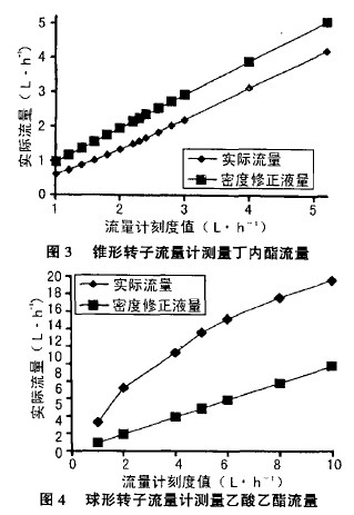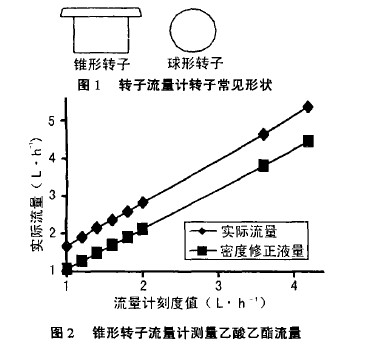 轉(zhuǎn)子流量計(jì)常見的轉(zhuǎn)子形狀如圖1所示,左邊圖形的轉(zhuǎn)子用廣泛,為錐形轉(zhuǎn)子;右邊的圖形為圓珠形,為球形轉(zhuǎn)子。用這兩種轉(zhuǎn)子流量計(jì),經(jīng)過測量,得到下列較為幾個(gè)典型的圖例。在錐型轉(zhuǎn)子流量計(jì)中,粘度為0.52mpa.s、密度為900kg·m-3’的液體乙酸乙醋的實(shí)測結(jié)果見圖2,粘度為1.gmPa·s、密度為1050kg·m-3的丁內(nèi)醋的實(shí)測結(jié)果見圖3,圖中所示的密度修正流量曲線指的是僅以密度進(jìn)行修正的曲線,其修正公式為。