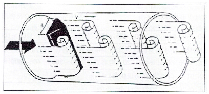 在蒸汽流體中設置三角柱型旋渦發生體,則從旋渦發生體兩側交替地產生有規則的旋渦,這種旋渦稱為卡門旋渦,如右圖所示,旋渦列在旋渦發生體下游非對稱地排列。