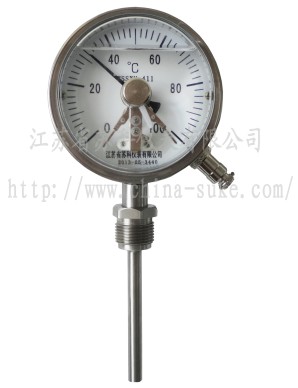 耐震電接點雙金屬溫度計是基于繞制成環(huán)性彎曲狀的雙金屬片組成。一端受熱膨脹時,帶動指針旋轉,工作儀表便顯示出所應的溫度值,并且防止環(huán)境振動在雙金屬溫度計內部充裝硅油以達到減震的目的。