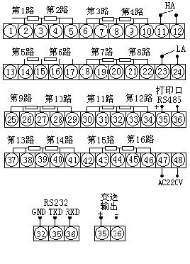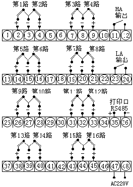 報(bào)警輸出: ⑴1-64通道統(tǒng)一上下限報(bào)警,繼電器輸出觸點(diǎn)容量 AC220V/3A