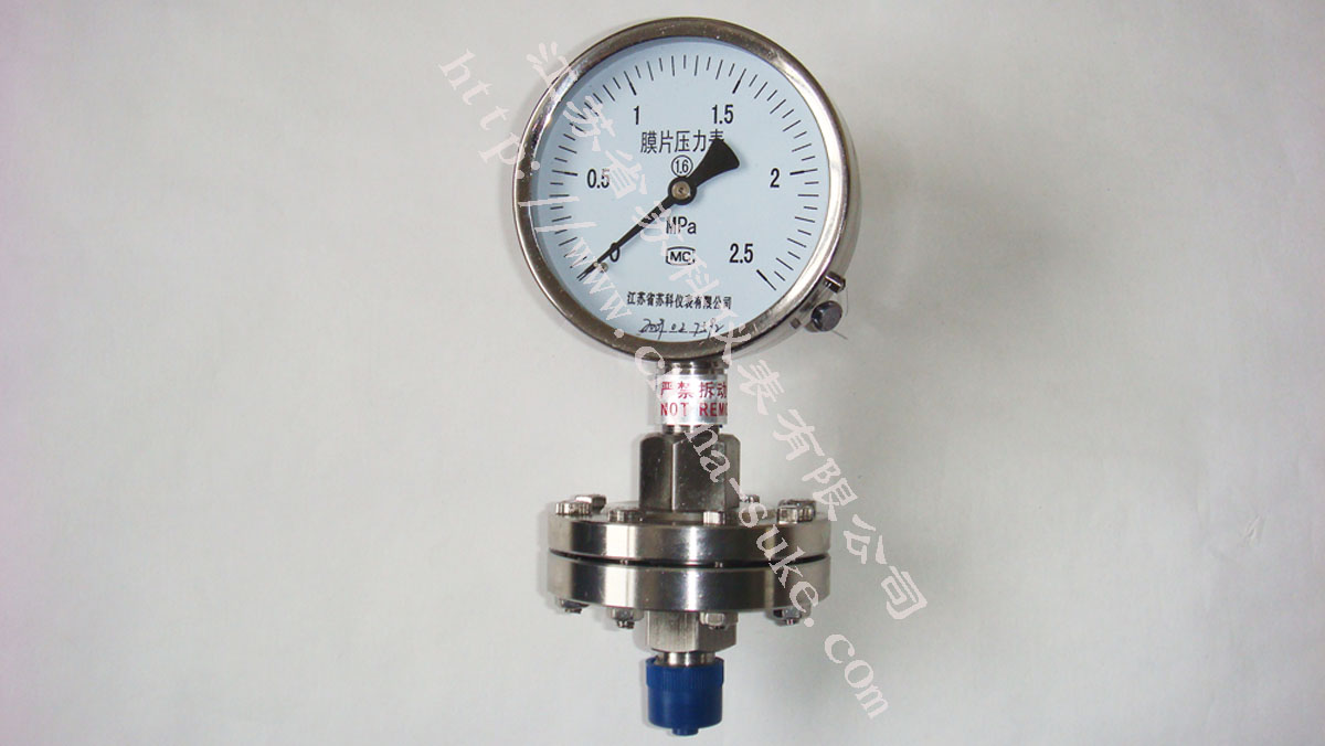 膜片壓力表由測量系統(包括法蘭接頭、波紋膜片)、傳動指示機構(包括連桿、齒輪傳動機構、指針和度盤)和外殼(包括表殼和罩圈)等組成。膜片壓力表外殼為防濺結構,具有較好的密性,故能保護其內部機構免受污穢浸入。